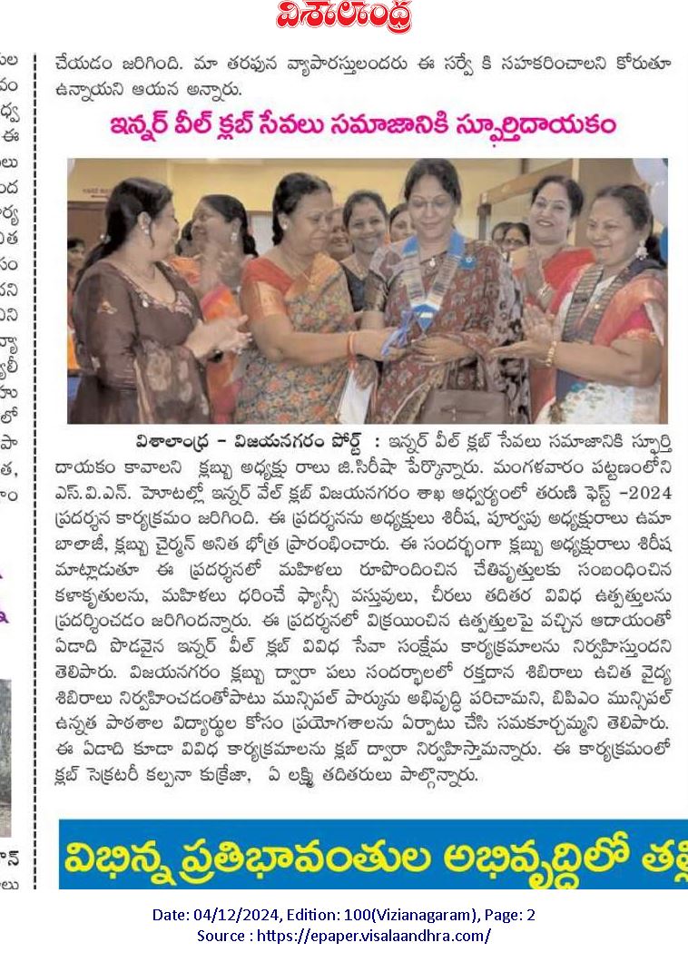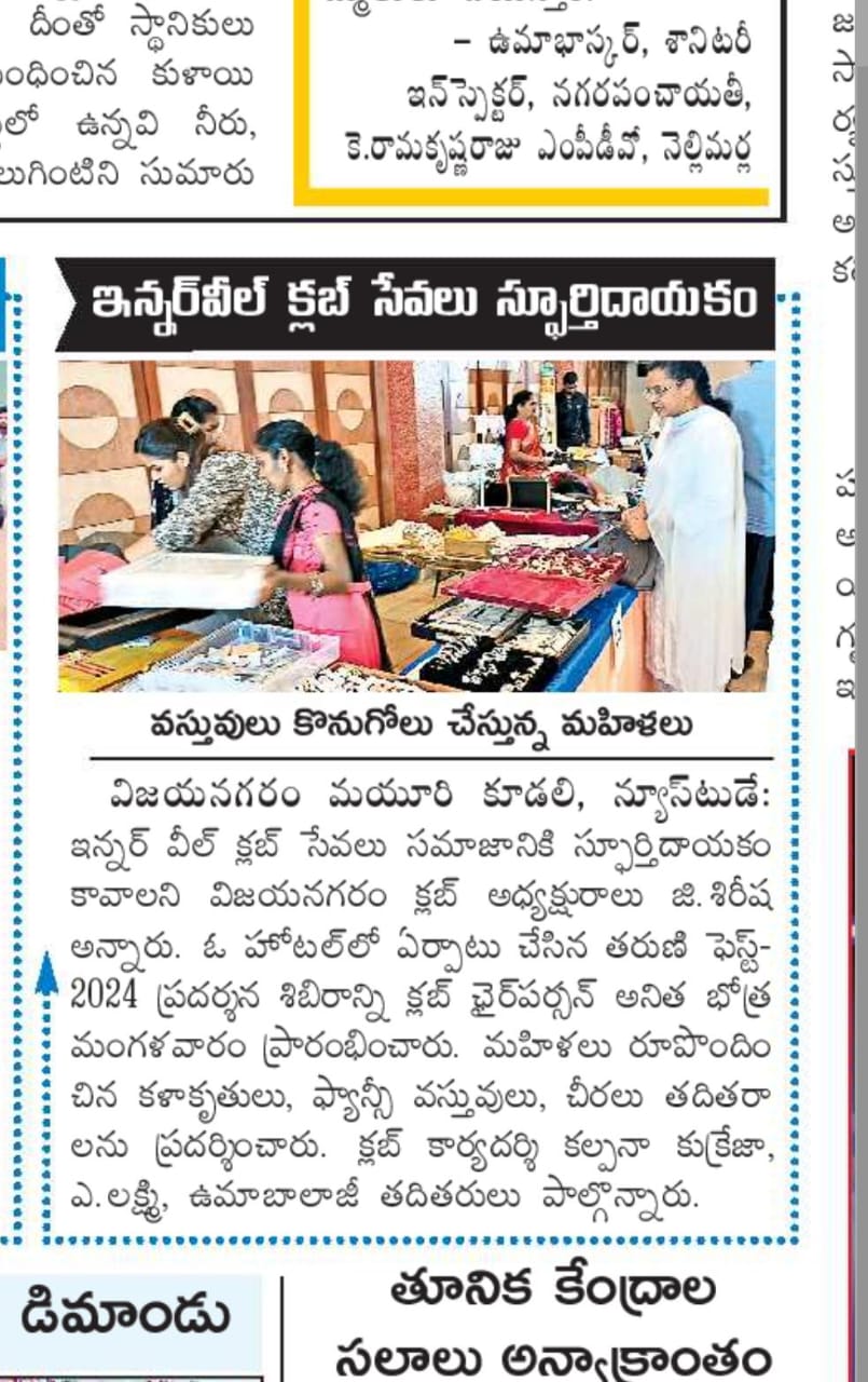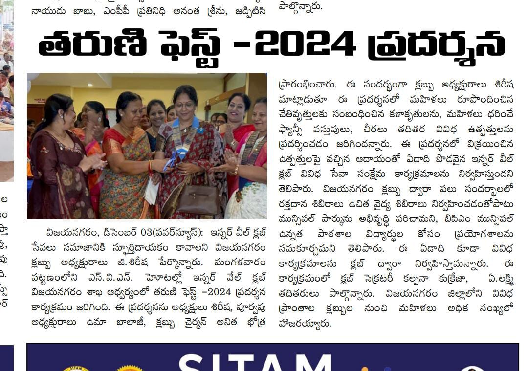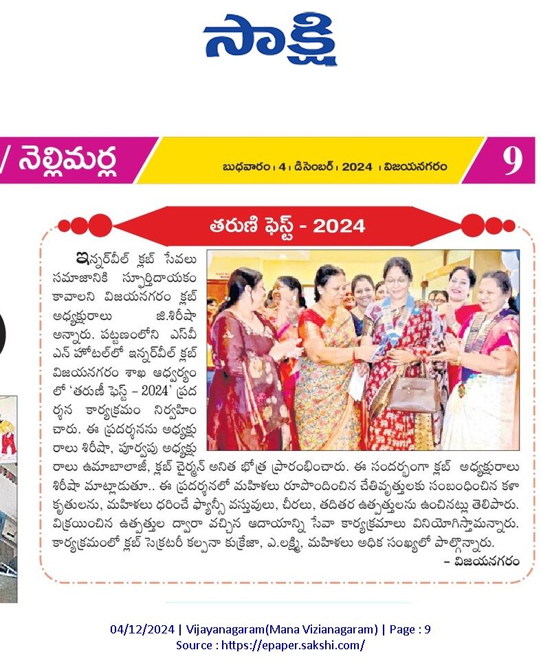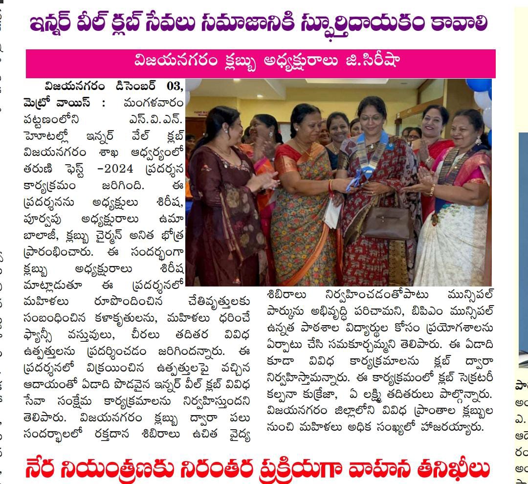 We organised a Taruni shopping fest 2024 on 3rd December..before Pongal..,.we invited all ladies who do buisness at their houses in small scale like selling dresses,sarees,do works on blouses ,bakes cakes and cookies…to highlight this programme we invited gold shops also…..concept is….. Women supporting Women…..conducting some games we collected amount for school bags to children….it is a very good Branding programme too.There was a very good media coverage too