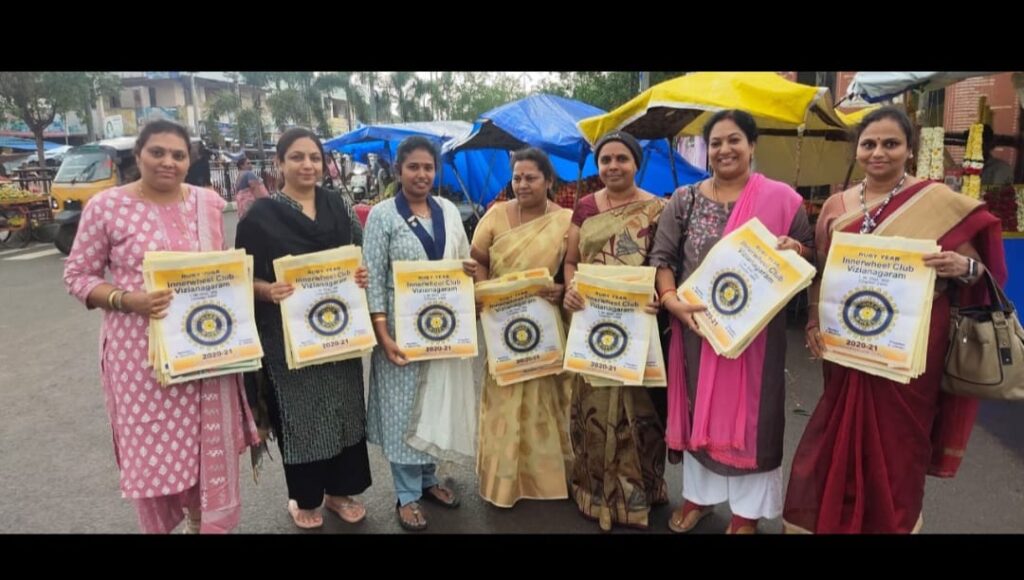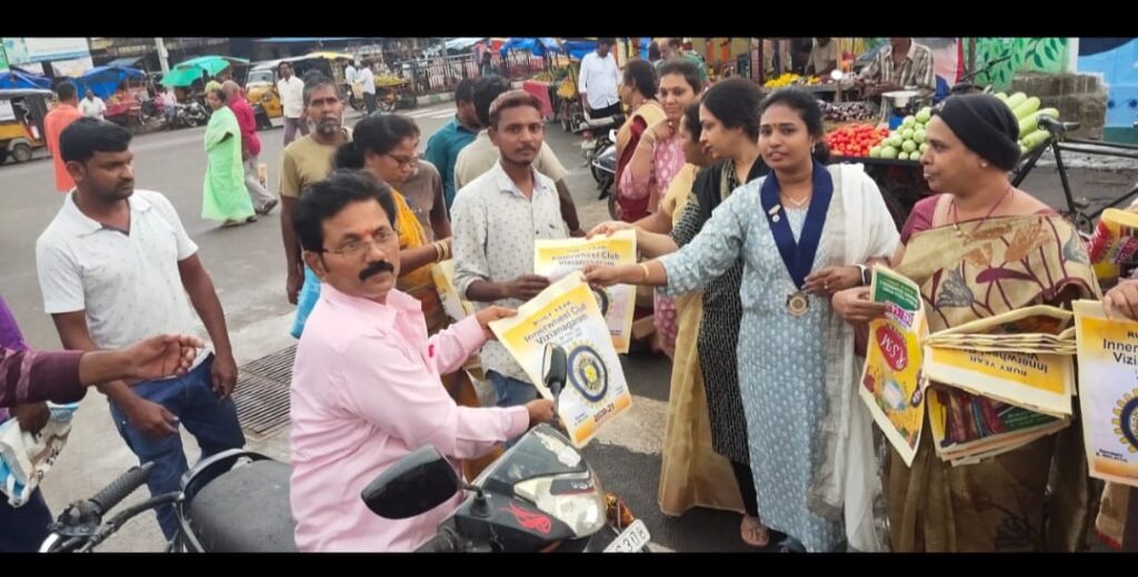 Members distributed 100 cloth bags printed with Innerwheel logo at a very busy fruits and vegetables selling place in vizianagaram.As a part of branding and to create awareness to avoid plastic bags planned this.