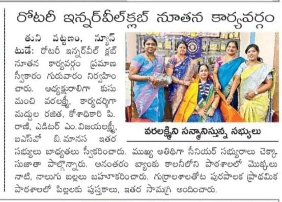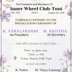 The Inner Wheel Club of Tuni warmly celebrated the installation of its new team for 2025–2026. The event included a discussion on upcoming service projects and a heartfelt felicitation to the outgoing President and Secretary for their dedicated service. Chief Guest and Rotarians were honoured with shawls and plant saplings as tokens of respect. Fun-filled games were organized for members, and prizes were distributed, adding joy to the occasion. The gathering reflected unity, gratitude, and enthusiasm for the year ahead