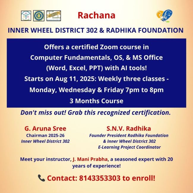 Inner Wheel District 302 and Radhika Foundation organised Zoom Course on Computer Fundamentals , weekly 3 days Our President Lavanya Sponsored training for 3 members and other members sponsored 1 student. Totally 4 members were sponsored by our club