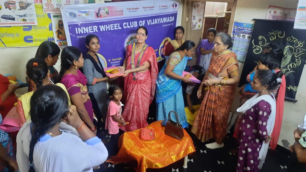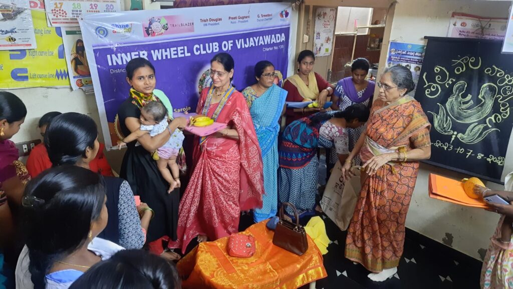 Name of the Club: Inner wheel club of vijayawada District Number:302 District Chairman: Mrs G. Sreedevi District Editor: Mrs. S N V Radhika Project TRAIL BLAZER : BREAST FEEDING Date: 07/08/2023 Project details:As part of breast feeding week we went to ANGGANVADI and we distributed sarees, fruits, bread, biscuits to pregnantwomen and breast feeding moms