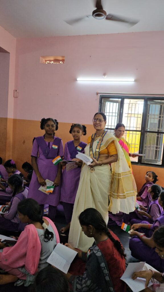 Date:15-08-2023 Project: TRAIL BLAZER – RIGHTS AND RESPONSIBILITIES Project Description::*Independence Day Celebrations Inner Wheel Club of VIJAYAWADA Celebrated Independence Day at Government High School-KRISHNALANKA. We Distributed Slates and slate pencils, Notebooks, pens and pencils, biscuits and chocolates to children along with SECRETARY-T.JANAKI. Given Speech about Independence. Beneficiaries : 150 Worth : 7000/- Sponsor – SECRETARY T.Janaki-5000/- President V.l.Saoja-2000/-