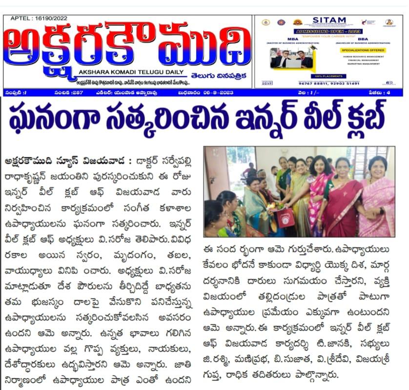 Discription: Teachers are the backbone of our society. Once said by Dr.Sarvepalli Radhakrishnan, a great teacher and a great scholar remembering him on his birth anniversary as a teachers day in India. On this auspicious day, We inner wheel club members of Vijayawada are happy to celebrate by felicitating some of the wizard teachers in the field of classical music, rhythm and dance from the great Institute of Ghantasala Sangeeta Kalasala. We have felicitated Vishnubhatta Krishnaveni (principal), K.Saraswathi (voice), G.Stephen Raju (Mrudamgam) V.Amrita Kumar (Tabla), A.Shobha Lakshmi, CH.Ajay (Kuchipudi), B.V.L.Sowmya (Natyam), M.Chandra Prasad, M.Krishna Triveni, M.Madhuri. In the simple symphony of life, music, teachers are the conductors, directing students towards harmony and success, their influence extent far beyond the classroom shaping the lives of those they touch. We thank these heroes.