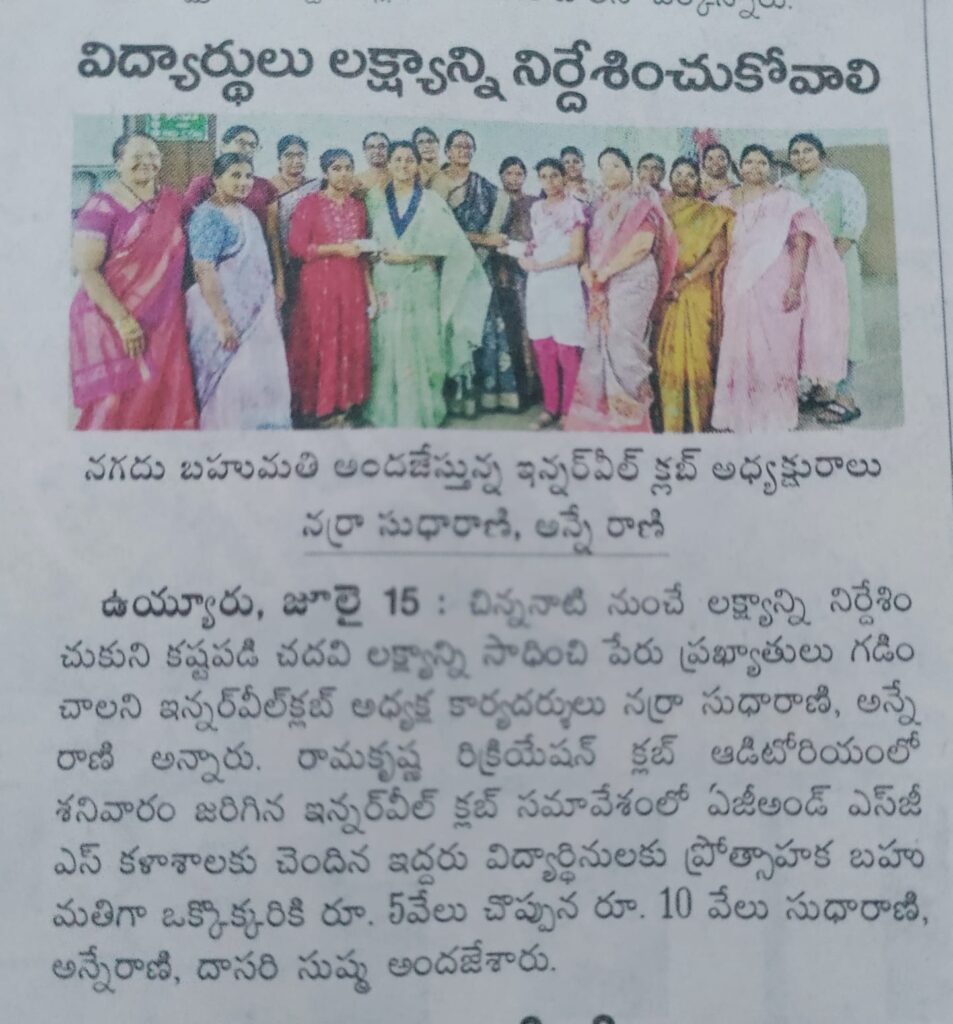 INNER WHEEL CLUB Of UYYURU. 2. DISTRICT CHAIRMAN: G. SREE DEVI. 3. District Editor: SNV Radhika. 4. President: N . Sudha Rani. 5. Project TRAIL BLAZER: Children Education. 6. Project description: Inter Student Shaheera begum to 945 Mark’s and highest marks in 10th class student V Venkateswarao for education support. 7. Beneficiaries: 2. 8 Amount Spent : Rs 10,000.