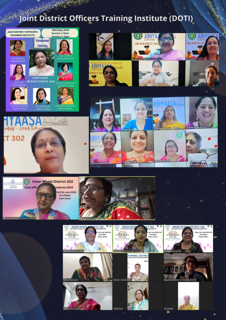 Together with Districts 315, 316, 317, and 318, the Joint District Officers Training Institute DOTI “Abhyaasa” was conducted on May 28, 2024, via Zoom, with Association President 2024-25 Sunita