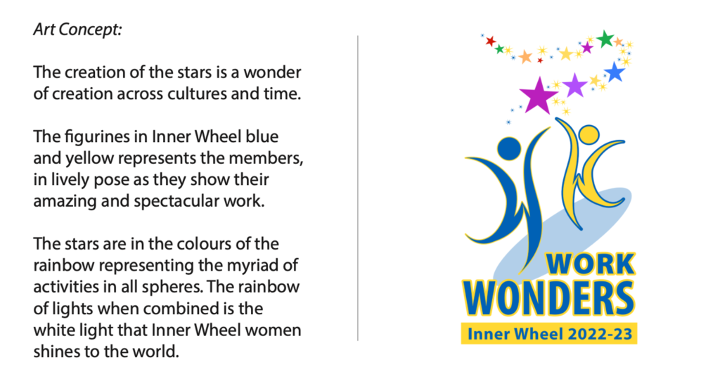 There is indeed no substitute for hard work. The IIW Theme Work Wonders lays emphasis on putting our best efforts in the cause of Inner Wheel. We Care is the call at the national level that covers a wide spectrum of service activity which will be detailed in the next pages. Caring and sharing are typically feminine and maternal traits which all of us can easily relate to. Adding a dash of dare – leaping into action when needed, defending those who are more vulnerable gives a totality to the theme.