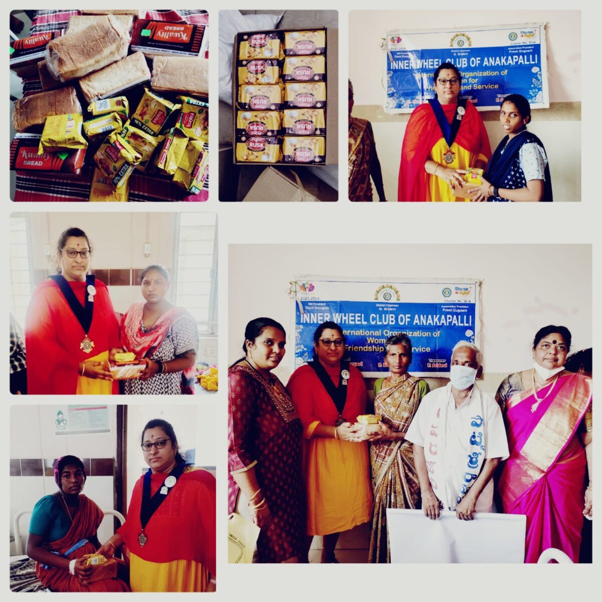 Description:- Our Inner wheel members donated bread , raskulu,butter milk packets , biscuits and bread to all patients nearly 200 people at Government Maternity hospital .