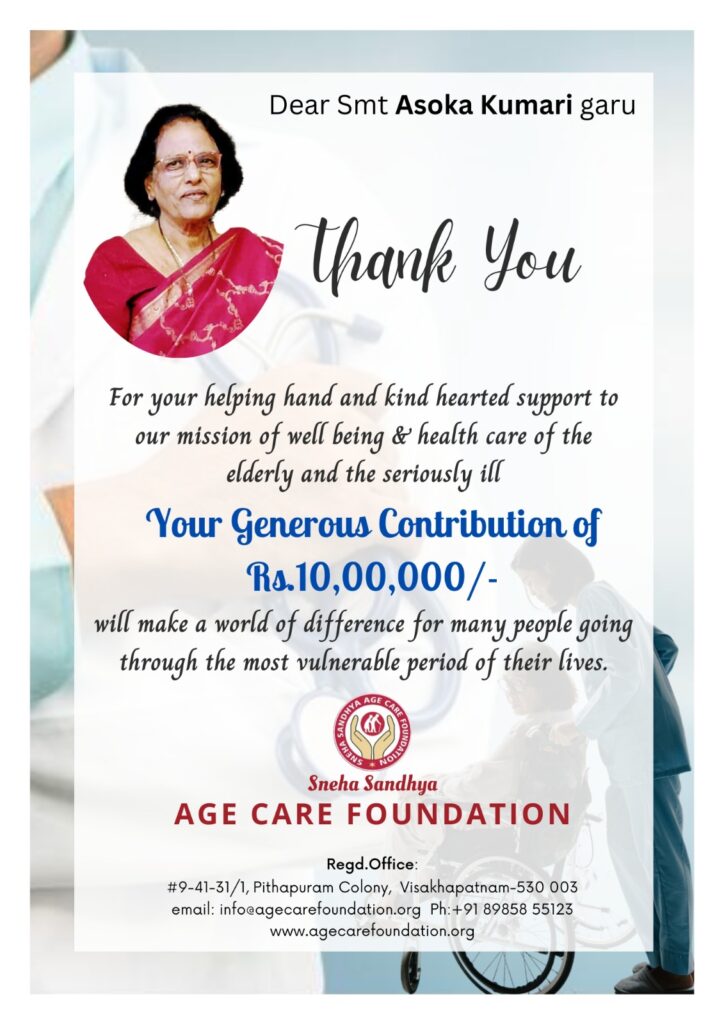 Project details Generous contribution towards humanity by our PDC Ashoka garu .She donated to ACF( an organization which takes care of terminally ill cancer patients and geriatric care) Rs10,00,000 for medical expenses of patients.On her daughter’s and granddaughter birthday she donated Rs 2,00,000 to ACF.Total Rs 12,00,000.A very generous lady.